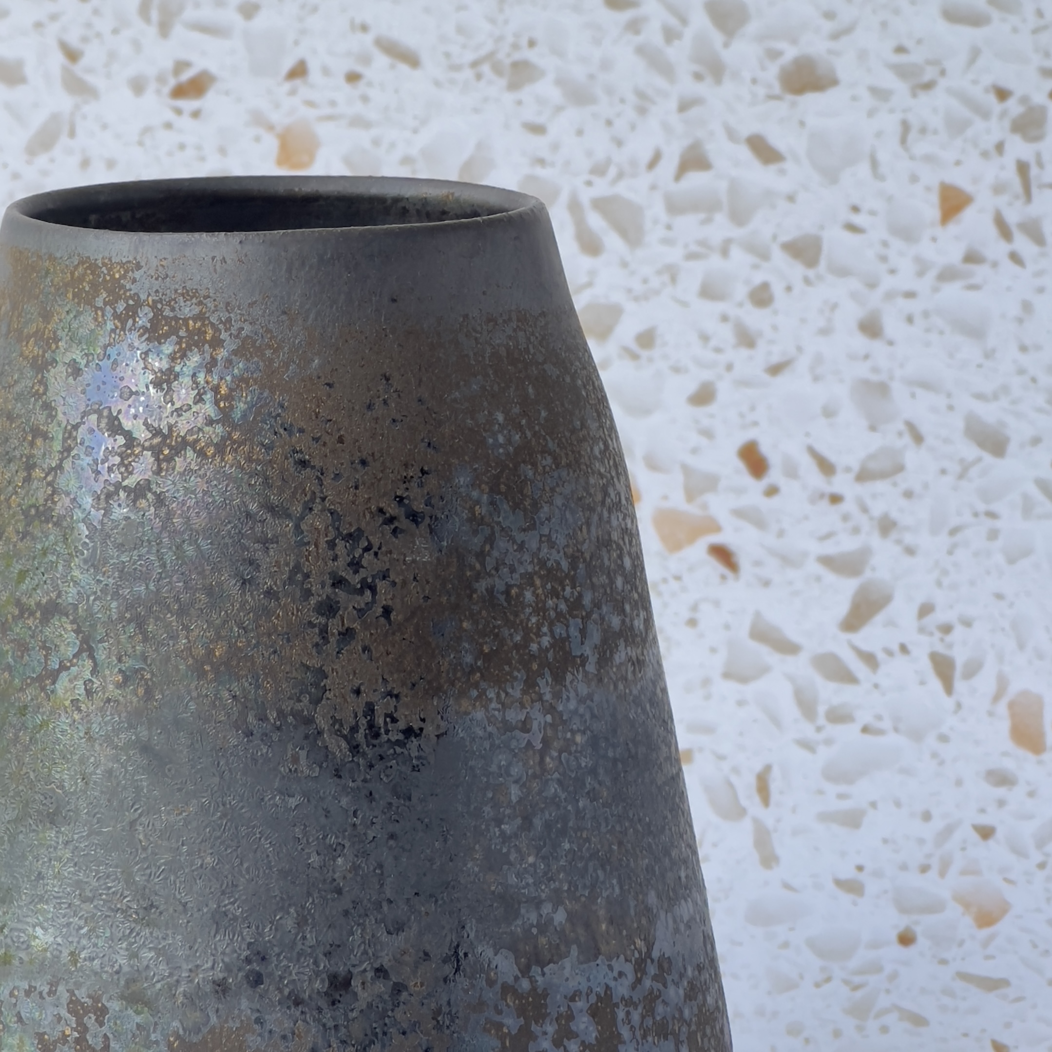 Denne unikke keramikvase forener det rå og det raffinerede. Formen er blødt flasket med en naturlig tyngde, og overfladen er mat og levende – metallisk – med nuancer af sort, mørkgrøn og brun. Finishen giver et udtryk af noget ældet, arketypisk og jordnært.