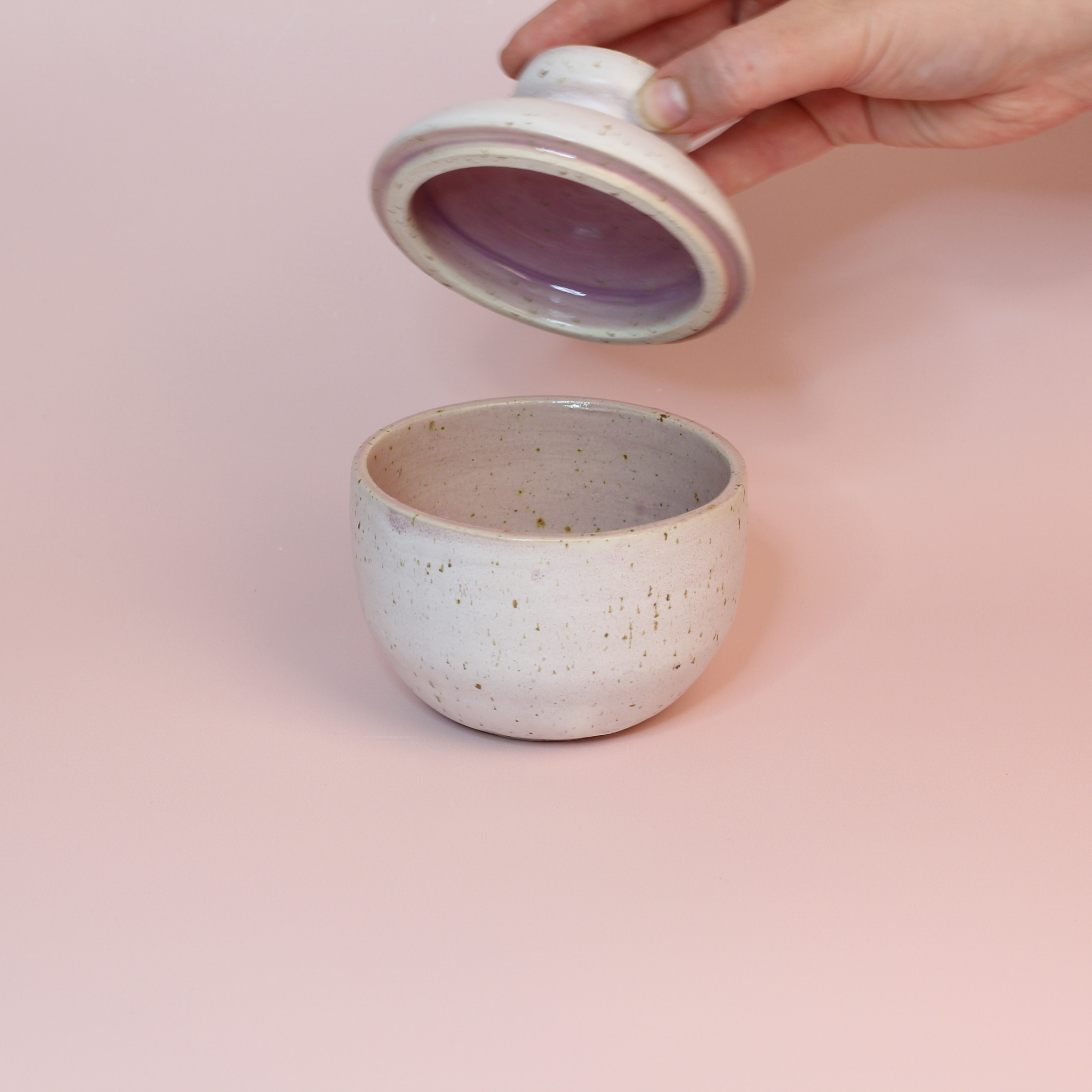 Opbevar dine værdifulde genstande i dette smukke hånddrejede skrin, der kombinerer en violet kerne med en elegant mat hvid overside. Den indvendige violet farve tilføjer en overraskende og livlig detalje, der gør skrinet endnu mere unikt.
